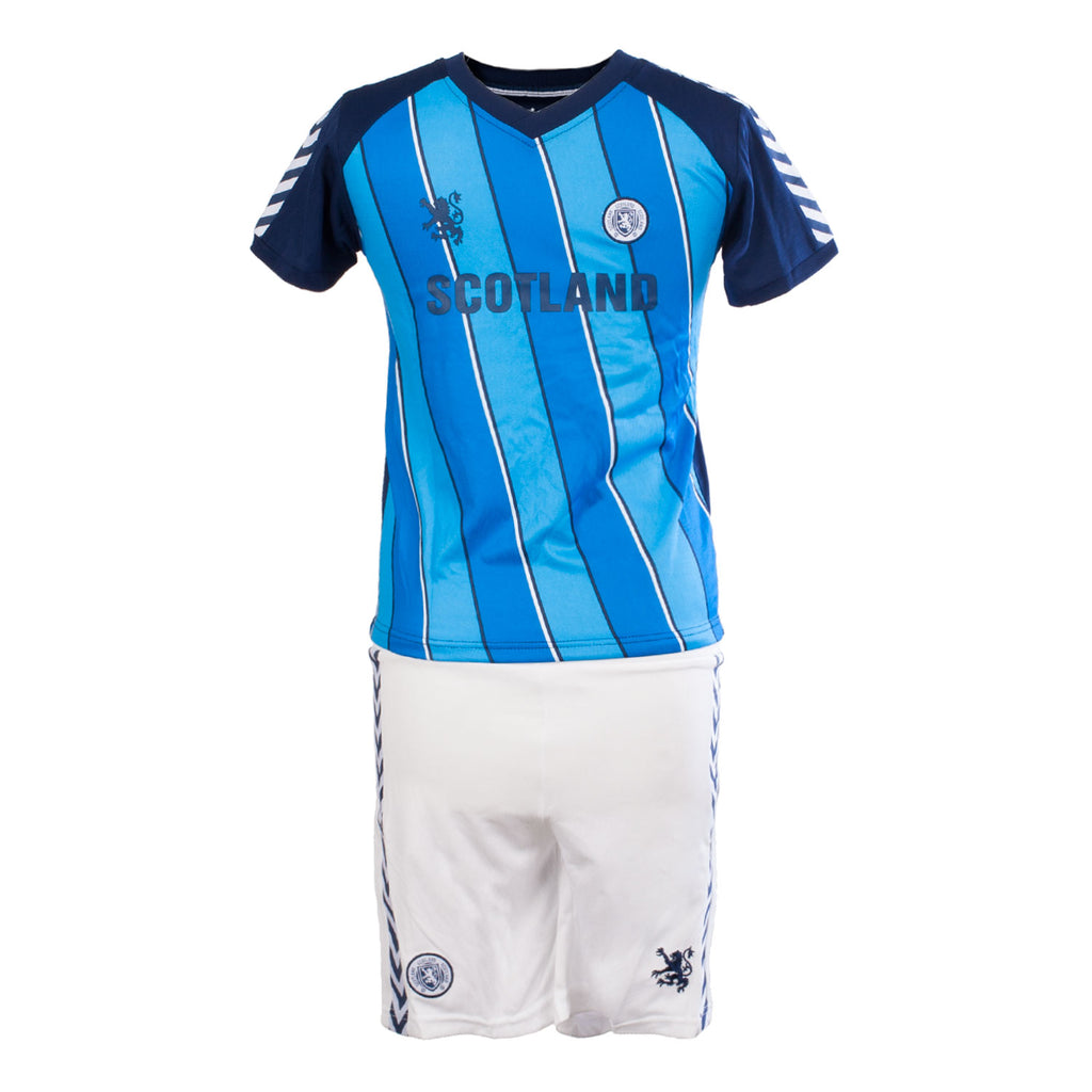 A quality kids football kit that has ''Scotland'' printed across the T-Shirt with a Lion Rampant and national crest above, completed with a pair of loose fitting white shorts.